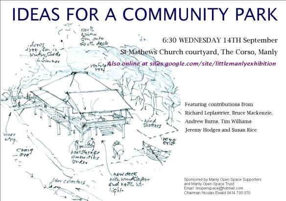 September 2011: Architects and Landscape Architects – putting forward proposals to allow greater public access to Little Manly Beach and create a real gem within the coves that encirle Sydney’s Harbour. Schemes including AM Bruce Mackenzie’s and RAIA gold medal winnner Rick Leplastrier’s as shown above, amongst others.